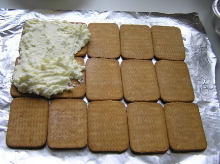 - Печененки обмакиваем в молоке и выкладываем на пищевую фольгу по схеме 3х5 (3 ряда по 5 печенек).