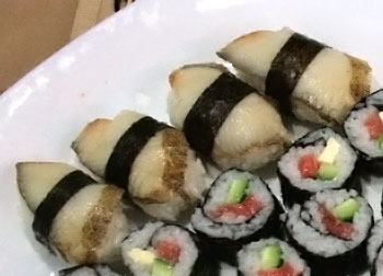 Рыба у меня была уже в нарезку, а чтобы было симпатичнее я делала полосочки из нори.