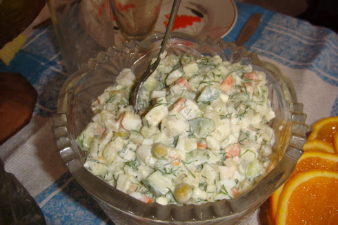 Все нарезать маленькими кубиками как в обычное оливье, добавить горошек, заправить сметаной и зеленью. Посолить по вкусу.