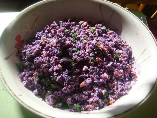 Нежно сиреневый салат с голубымиСалат с краснокочанной капустой, морковью, зелёным луком и сливками яйцами 🙂