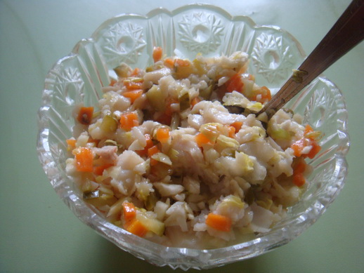 Рыбу опустить в кипящую подсолёную воду с душистым горошком и лавровым листом. Поварить несколько минут, достать, остудить, нарезать кубиками.