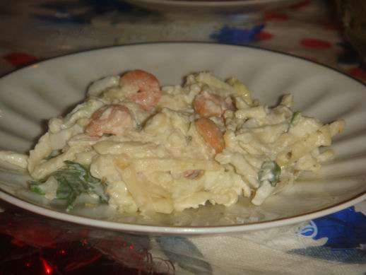 Креветки обдать кипятком, почистить (чищенные отварить до закипания). Яблоки почистить, порезать кубиками. Авокадо разрезать пополам и вынуть мякоть чайной ложкой. Яйца почистить и порезать тонкими ломтиками. Всё смешать с майонезом, добавить зелень, измельчённый чесночек, сок лимона, соль, белый перец по вкусу.