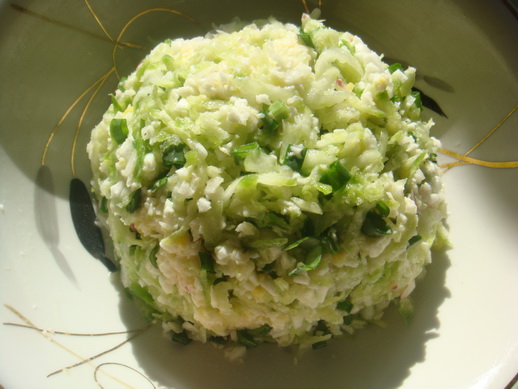 Огурец также натереть на тёрке или порезать тоненькой соломкой. Зеленый лук мелко нарезать.