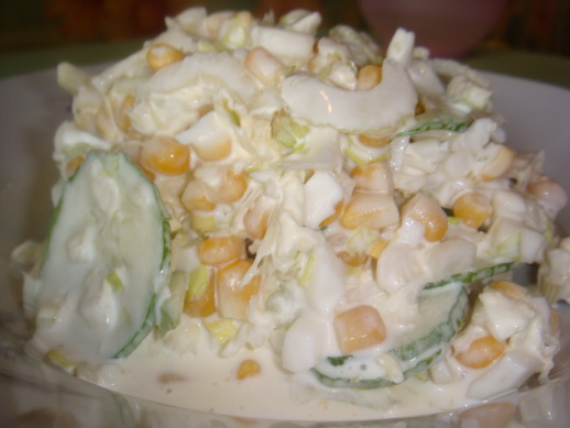 Сначала нарезать тонкими ломтиками огурцы, сельдерей и капусту. Затем мелко нарезать варёное яйцо , добавить кукурузу и заправить майонезом или сметаной (можно смесью).
