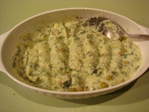 Яйца сварить и измельчить с зелёным луком и солью до состояния каши. Добавить укроп и зелёный горошек. Заправка не нужна.
