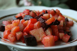 Овощи отварить. Всё порезать кубиками, заправить маслом.