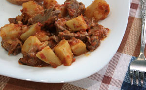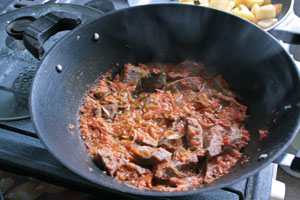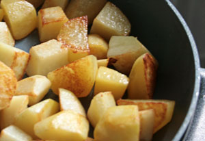 Пока все это тушится картофель нарезаем крупными кубиками, обжариваем на сковороде и выкладываем в мясо.