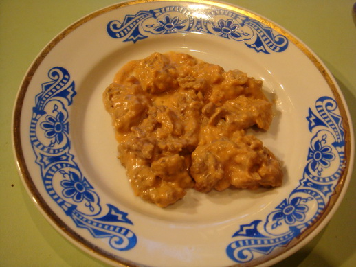 В отличие от классического рецепта бефстроганоф, здесь сначала мясо надо хорошенько отбить, а потом уже нарезать маленькими ломтиками длиной 3-4 см. А потом также, как в классическом рецепте, выложить на разогретую сковороду с луком, обжарить в масле, потушить на мелком огне до выпаривания жидкости от мяса. Потом посолить, добавить муку, сметану и ложку томат-пасты, довести до кипения.Если сметана густая, то добавить бульона. Ещё немного потушить. Подавать с пюре и со свежей зеленью.