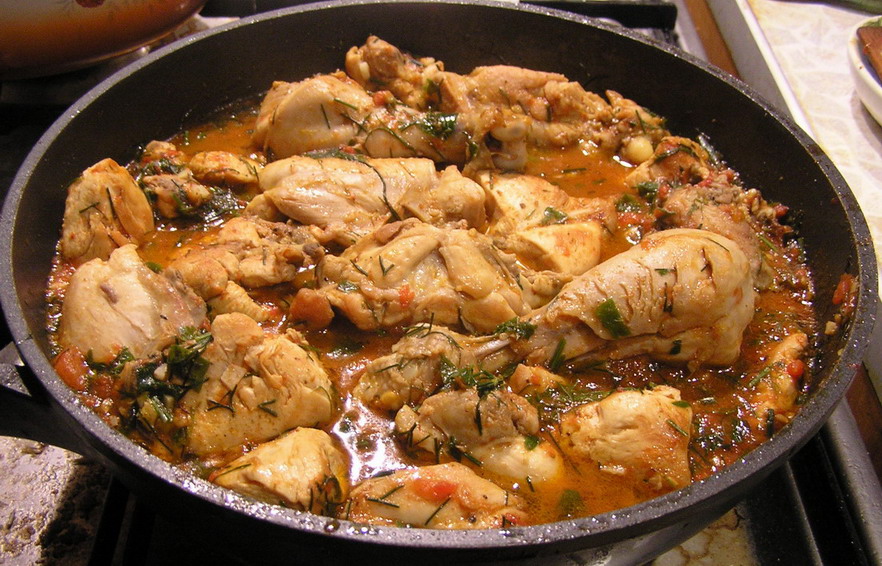 Цыпленок рубится на достаточно мелкие куски и обсушивается в полотенце, после чего укладывается в разогретую тефлоновую глубокую посуду и накрывается крышкой. Тушим на слабом огне примерно 5 минут, после чего появившийся сок от цыпленка сливаем в стакан. Крышку снимаем и жарим еще 8-10 минут до появления корочки, добавляя постепенно сок, чтобы цыпленок не подгорел.