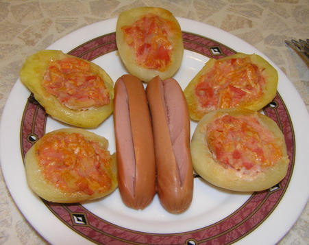 - Разрезать каждый клубень пополам, вынуть ложкой серединку. Положить половинки картошки на смазанный растительным маслом противень.