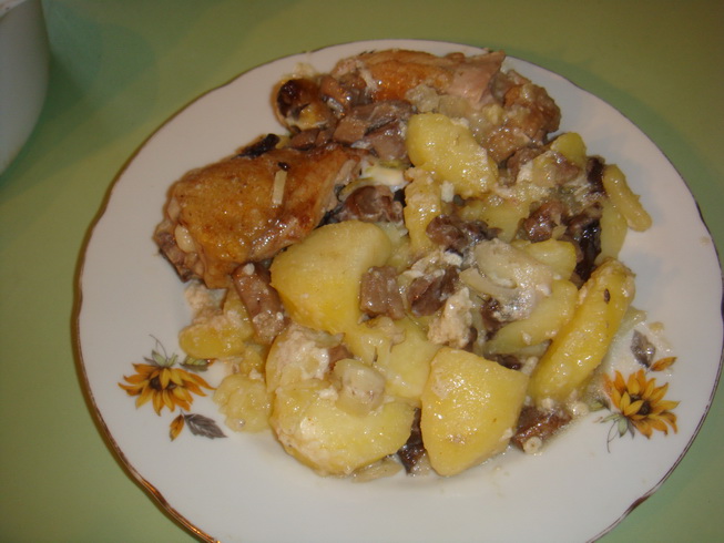 Картофель очистить, отварить. Курицу(или филе) посолить, приправить,(можно слегка отбить), разрезать на небольшие кусочки и обжарить с обеих сторон на сильно разогретой сковороде. Сделать грибной соус: сгрибы заранее замочить, отварить и спассеровать с луком, мукой и сметаной. Добавить бульона или воды.
