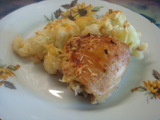 Курицу натираем солью, приправой (при желании можно замариновать любимым способом). Выкладываем в форму курицу и цветную капусту (можно не размораживая) и запекаем в горячей духовке 20 минут. Достать форму, слегка посолить капусту, перемешать с выделившемся жиром от курицы. Если мало жидкости, то добавить немножко воды или бульона. Можно потереть сверху сыром. И запекать ещё 30 минут. И всё.