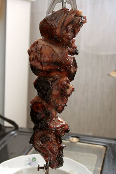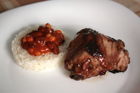 Бедро было предварительно замариновано. Для маринада я взяла лук, соус Наршараб, коньяк, соевый соус. Пропорции на глаз. Потом мы его жарили на вертеле, периодически поливая маринадом. На гарнир отварной рис и фасоль в томатном соусе.