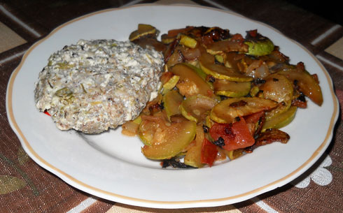 Гарнир любой. У меня кабачок жареный с помидоркой и базиликом.
