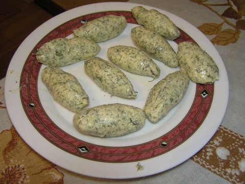 Подготовить начинку. Для этого натереть сыр на мелкой терке. Зелень мелко порезать. Взять размягченное сливочное масло (я беру масло из холодильника и ставлю секунд на 15 в микроволновку). Хорошо перемешать размягченное сливочное масло, сыр и зелень. Сформировать из маслянно-сырной смеси небольшие «шишечки» и убрать их в морозилку минут на 10, чтоб масло немного застыло.