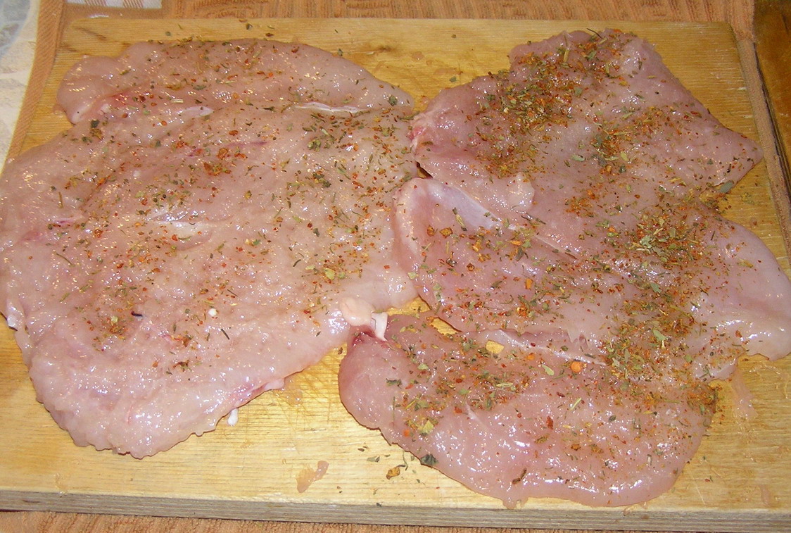 1. Куриное филе отбить, посолить, поперчить, если хочется — посыпать специями (P.S. Я, кстати, считаю, что лучше аджики для курицы специй не придумали).