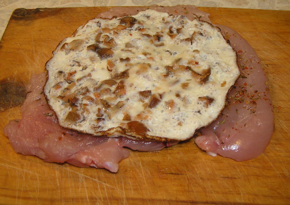 2. Приготовить грибной омлет. Грибы разморозить (если замороженные), мелко порезать (я слегка измельчила в блендере (но не в пасту!)), добавить 2 яйца, посолить, слегка взбить. Добавить немного молока. Вылить на разогретую сковородку, довести до готовности. Я жарила 3 омлета на маленькой сковородке, чтоб размер омлета примерно совпадал с размером отбитого филе. Омлет должен быть не слишком толстым, иначе будет трудно сворачивать рулет.