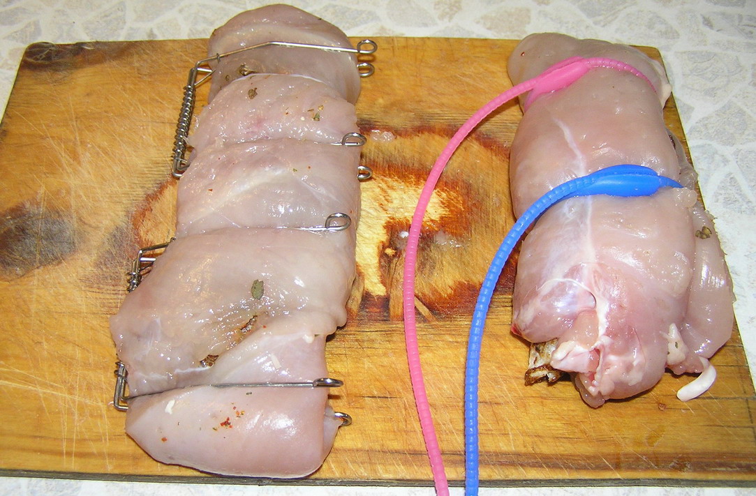 3. Готовые омлеты остудить, выложить на куриное филе. Свернуть рулеты.