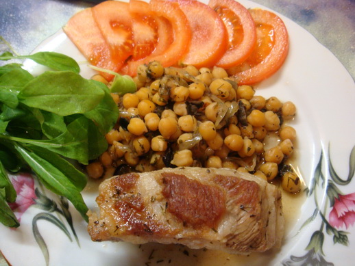 Положить в соус рёбрышки и свареный нут. Залить стаканом воды или бульоном от нута. Тушить ещё на медленном огне полчаса.
