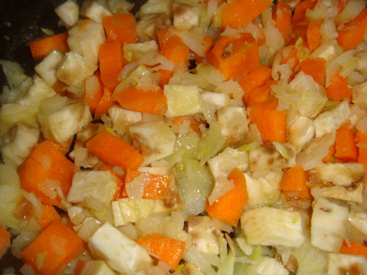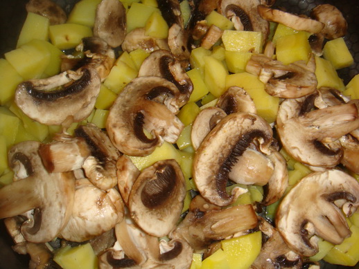 Все овощи вымыть, очистить, нарезать крупными кубиками. Грибы нарезать крупными дольками.