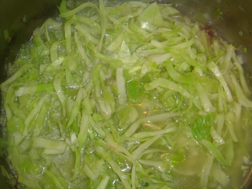 Поджарить муку и развести капустным отваром. Добавить измельчённые томаты (или 2 ст.л. томатной пасты) и прокипятить. Добавить по вкусу соль, перец, гвоздику, корицу.