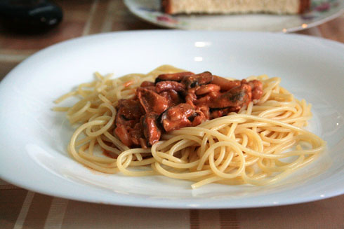 Выкладываем на тарелку спагетти, в серединку — морепродукты, сверху можно посыпать тертым сыром.
