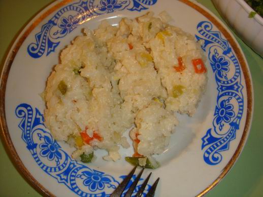 Кальмары очистить от плёнки. Мелко нарезать. Обжарить с овощами, добавить молока(воды) и потушить. Добавить свареный рис, соль, специи.