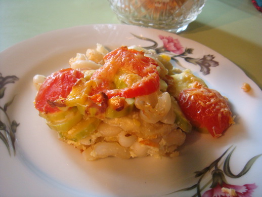 В форму для запекания, смазанную маслом, выложить варёные рожки (или другие макароны), колечки кабачков, баклажанов, помидоров. Смешать полстакана молока, яйцо, соль, специи(или травки), залить овощи. Сверху можно посыпать измельчённым зубчиком чеснока и тёртым сыром. Запекать в духовке 30 минут.
