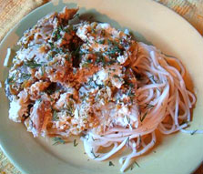 Яйца смешать со сливками, сметаной, солью, перцем. Залить рыбу и поставить минут на 25 в духовку при 200 гр.