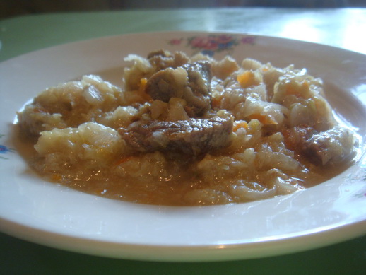 Мясо отварить с солью, травками. Нарезать на кусочки. Чуть обжарить с измельчённым луком. Добавить нашинкованную капусту, залить бульоном и молоком в соотношении 1:1, довести до кипения и тушить в закрытой посуде на слабом огне до готовности капусты.