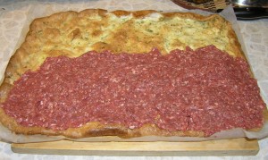 500 г мясного фарша (наверное можно меньше, у меня толстый слой мяса получился)