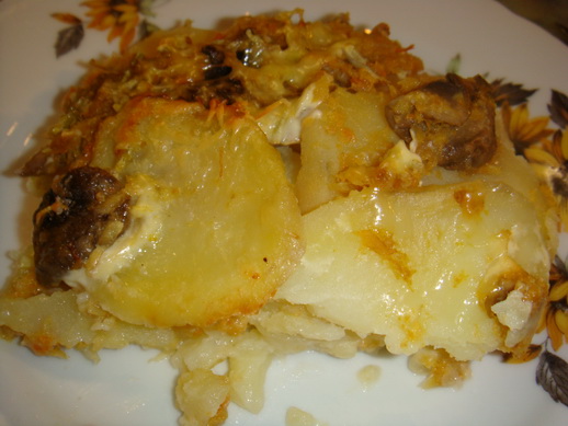 Картофель отварить в мундире. Почистить, нарезать круглешками, уложить в смазанную маслом форму. Сверху уложить грибы с луком. Посолить, посыпать любимой приправкой, натёртым чесноком, можно немного сыра. Залить молоком и поставить в духовку на 15 минут.