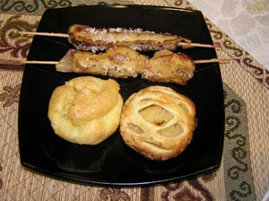 Раскатать 1 пласт теста, вырезать стаканом кружки. Второй пласт теста раскатать и сделать на нем надрезы длинной 12 мм на расстоянии 6 мм друг от друга, смещая их в шахматном порядке.