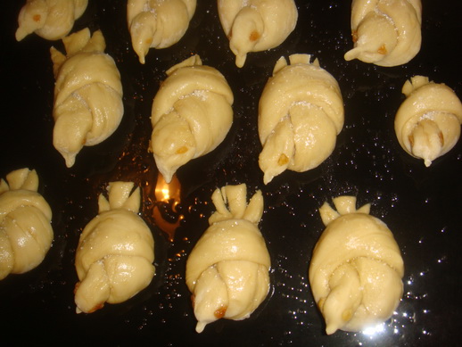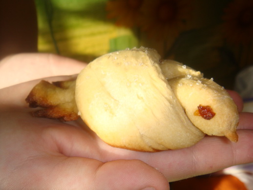 Смазываем противень, выкладываем на него птичек и даём расстояться. Перед выпечкой посыпаем жаворонков ещё сахаром и выпекаем их 15 минут при 180 градусах.