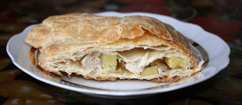 Сырой картофель и филе порезать мелкими кубиками, лук измельчить. Все перемешать, посолить, поперчить. Тесто раскатать, выложить начинку, сформировать пирог (можно и маленькие пирожки сделать). Можно смазать яйцом для красоты и в духовку (не очень горячую). Получилось пресновато, наверно можно добавить специи. Ели со сметаной.