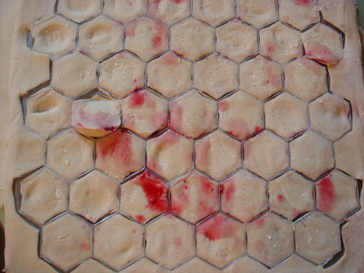 Металическую форму обсыпаем немного мукой, покрываем одной лепёшкой, пальчиками(или скалкой) делаем углубления для теста и заполняем фаршем (по пол чайной ложечки). Накрываем второй лепёшкой и сильно-сильно прокатываем скалкой, пока вареники сами не отделятся от формы.