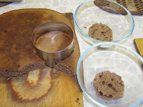 Я пекла 1 толстый бисквит, решила что так будет оптимальней «раскраивать» — вырезать кружки и разрезать их по толщине на 2 части