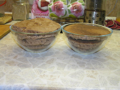 В результате у вас должно получится следующее: 2 полусферы, заполненные бисквитными коржами. Я сначала раскроила, примерила, а потом все достала, и сложила бисквиты в миски уже прослаивая кремом.
