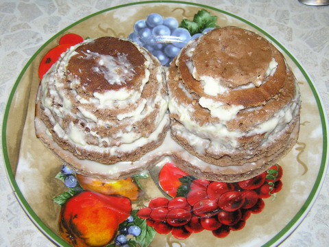 Торт этот очень знаменит и интернете и относится к тем тортам, в которых более важен внешний вид, а не содержание. То есть в нем главная фишка — в идее оформления, а «начинка» может быть любой. Я делала этот торт и с суфле, и с бисквитом… Нынче остановилась на начинке из торта «Прага», т.к. муж любит подобные торты — с кремом из сгущенки с маслом.