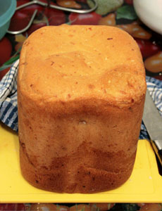 Все продукты (кроме последних трех) загрузить в хлепопечку в порядке, указанном в инструкции. Включить на основную программу (вес 700 г, корочка по желанию).