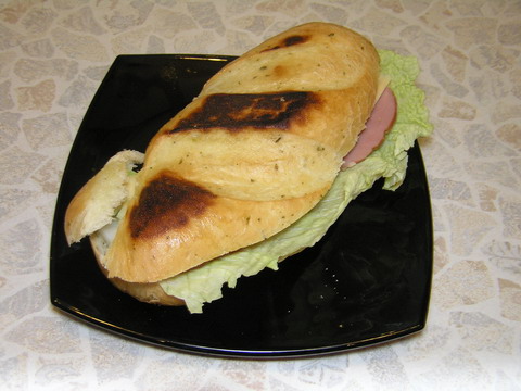 - Сложить бутерброд: вложить в багет лист салата, полить соусом, положить кружочки карбоната (или других мясопродуктов), огурец, еще немного соуса, сыр.