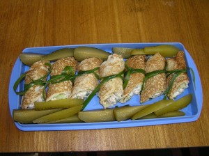 Свернуть рулетиком, скрепить шпажкой или связать луком/зеленью