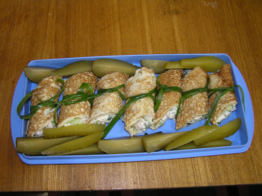 В блинчик завернуть начинку (ветчина/рыба/ курица, св огурец, сыр колбасный, зелень, майонез).