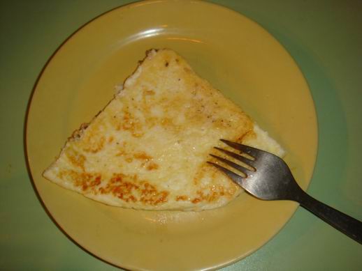 Яйца смешать с молоком, мукой и тёртым сыром. Взбить, посолить немного и вылить на сковороду. Поджарить на медленном огне под крышкой с двух сторон.