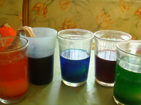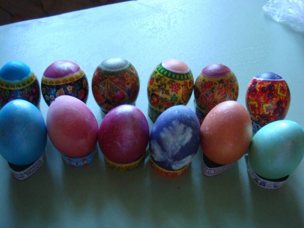 Яйца нынче красили в покупной перламутровой краске и наклеивали термонаклейки.