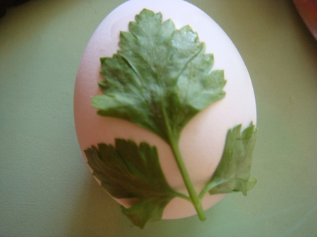 Нынче использовала такой способ покраски: прилепляешь листик петрушки на яйцо,одеваешь на него чистый капроновый носочек, завязываешь — и в краситель.