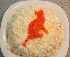 Салат у меня был французский. Сначала я хотела заполнить кота желтком, но он оказалось очень бледным. Тогда я решила сделать морковкой. Пришлось ее мелко потереть, выложить в трафарет и подравнять края, потом аккуратно убрать бумажку. Получилось неплохо, но лучше чтобы продукт, которым заполняем, был мелким. Тогда контуры будут ровными и картинка не расплывется.