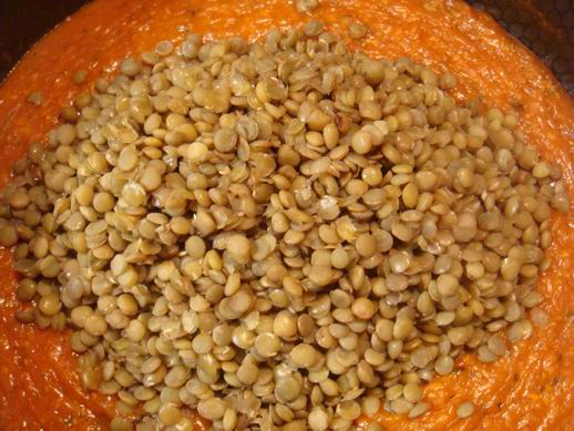 В готовый соус высыпать чечевицу. Перемешать.